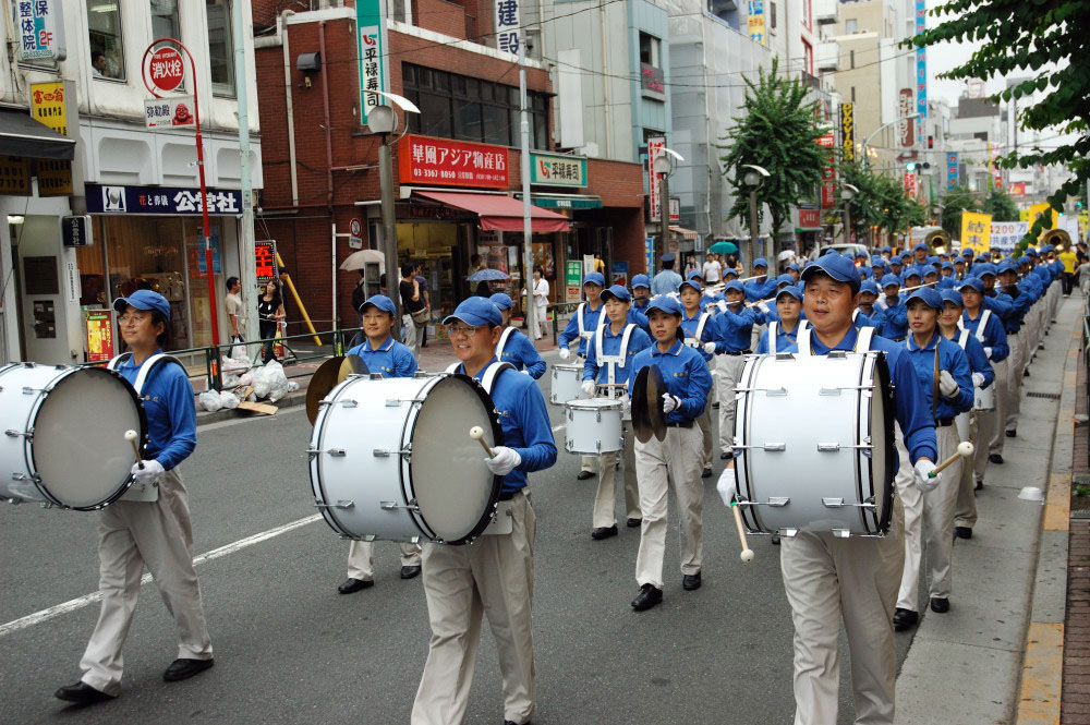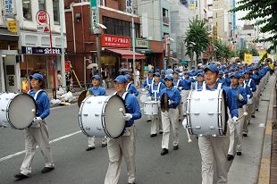 ![]() 声援退出中共的大游行在东京繁华市区举行,法轮功天国乐团为先导 |