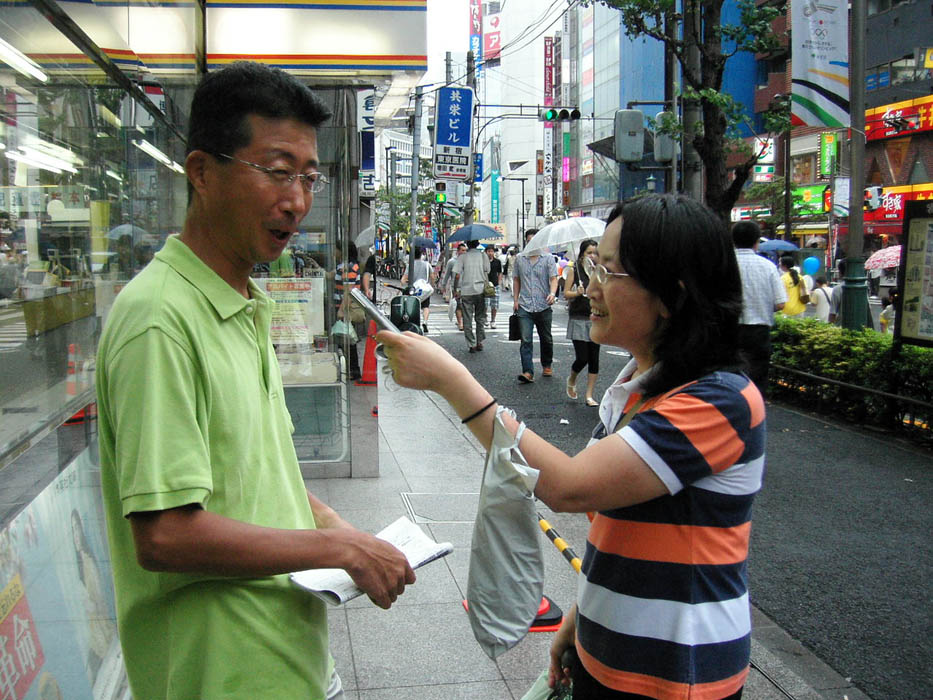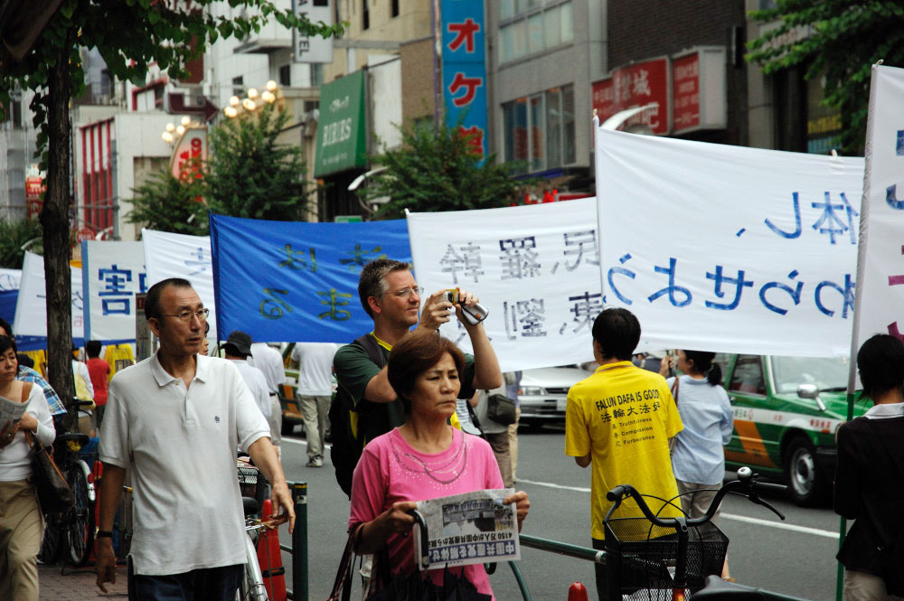 正值日本盂兰盆节(Bon vacation)假日连休的最后一天,虽然天下着小雨,街上行人和游客依然很多。许多人被游行队伍吸引,停下脚步观看并不时用相机和手机拍照,或者与游行队伍合影留念。队伍途经集中了华人和韩国人商家的大久保大道(Okubo Main Street)时,许多中国人感到震撼,不断的拍照,询问有关信息,索取更多资料。大道两侧大楼的商家或住户的大门和窗户不断被打开,人们一直在观看经过的游行队伍。
