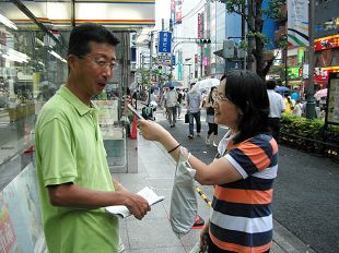 在新宿附近观看游行的公司职员吉田先生是头一次看到这样的游行场面,听了有关退!党!和中共侵犯人权的进一步说明后,他表示非常赞同声援退!党!。