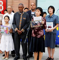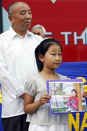 张芷硕去年九月份和姥爷一起来纽约,在异乡得到了母亲被抓的消息,对一个九岁的小女孩来说其心灵的伤痛是无以用语言来比拟的。她说,法轮功教人做好人,不知共产党为什么要镇压。她在昨天的记者会中当场宣读写给纽约市议员和美国布什总统的信,希望他们能帮助她妈妈,让她们母女早日见面。她的母亲是《辽沈晚报》记者贾亚珲,今年四月在参加其堂弟婚礼时被国安绑架。公安闯进屋去了,就说有点事,找她了解了解,就这么把她带走了。家人多方打听才得知她因为不放弃修炼,被非法劳教一年劳教。