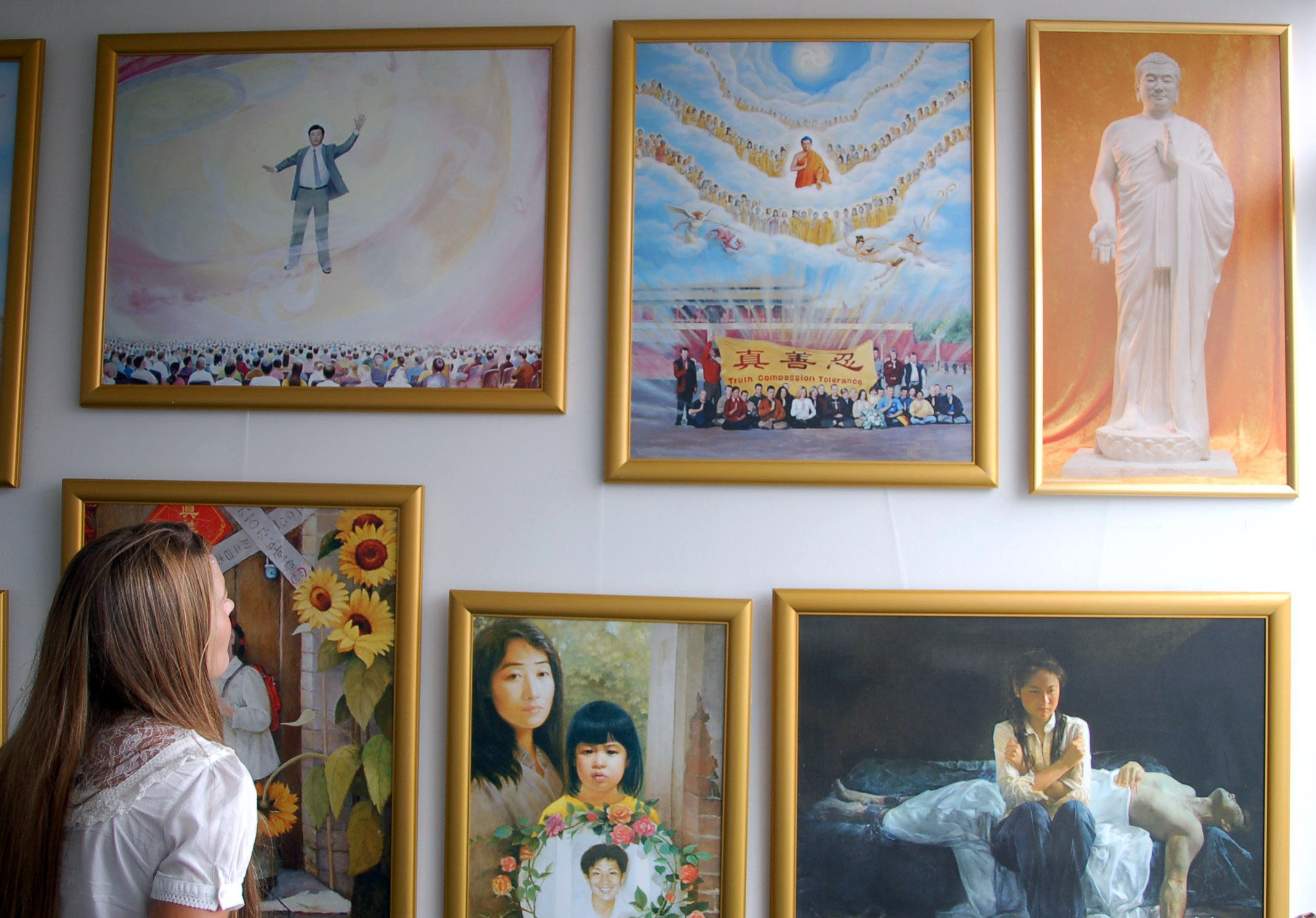 一位西人久久的站在画作《蒙难在中原》前,他对学员说:“我从这幅画中看到,画上表现了过去、现在和将来。过去,她的丈夫被迫害死;现在,她坐在监狱里死去的丈夫身边,非常伤心;但是,我已经看到她眼中坚毅的决心,我已经看到她将来会怎样,她会继续坚持自己的信仰。”