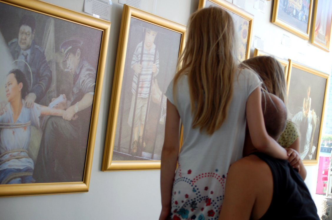 有一个孩子站在画前,任凭妈妈的催促,仍不愿意离开,并且指着其中一幅幅画,向妈妈问了许多问题。最后妈妈改变了原来要走的初衷,和女儿一起,倾听解说员讲解每幅画作。她说:“也好,让孩子去了解在世界上还有那么黑暗的一面,善良的人们在受迫害。”