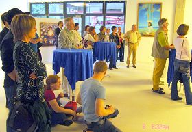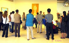 ![]() 画展现场,参观者听法轮功学员讲解画作。 |
