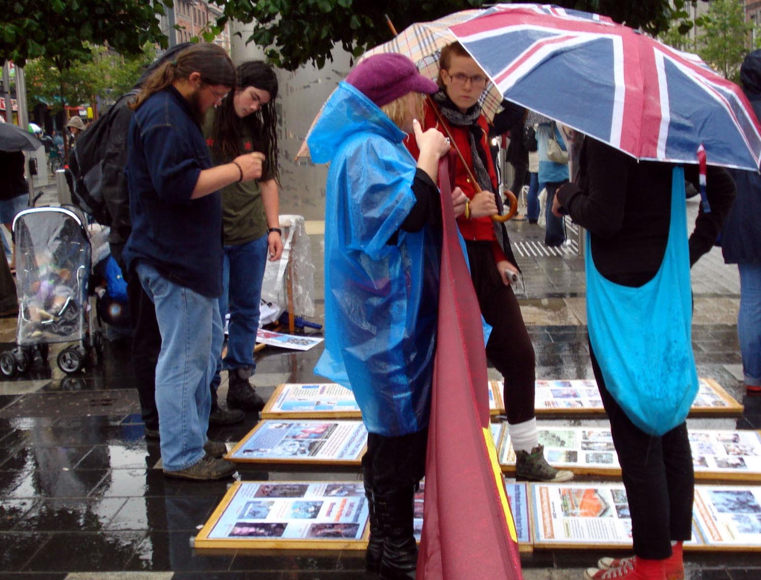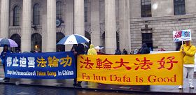 爱尔兰法轮功学员手持“法轮大法好”、“停止迫害法轮功”、“谴责中共借奥运之名加剧迫害法轮功”等横幅,在大雨中呼吁世人关注正在中国发生的迫害。法轮功学员王女士在集会上宣读了“追.查!国际”的紧急通告。她说,“从去年年底到今年六月三十日,全国非法抓捕法轮功学员的案例就有八千零三十七宗,法轮功学员被迫害致残、致死的恶性事件持续不断,迫害案例有增无减,被非法关押入监狱、劳教所、集中营、精神病院至今尚未释放的法轮功学员数以万计。”