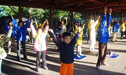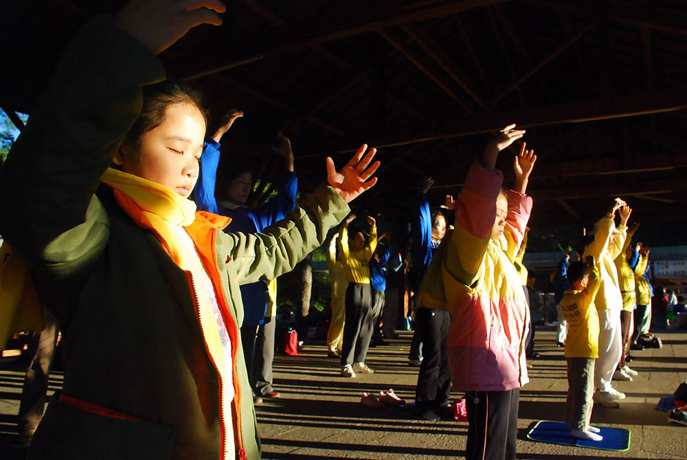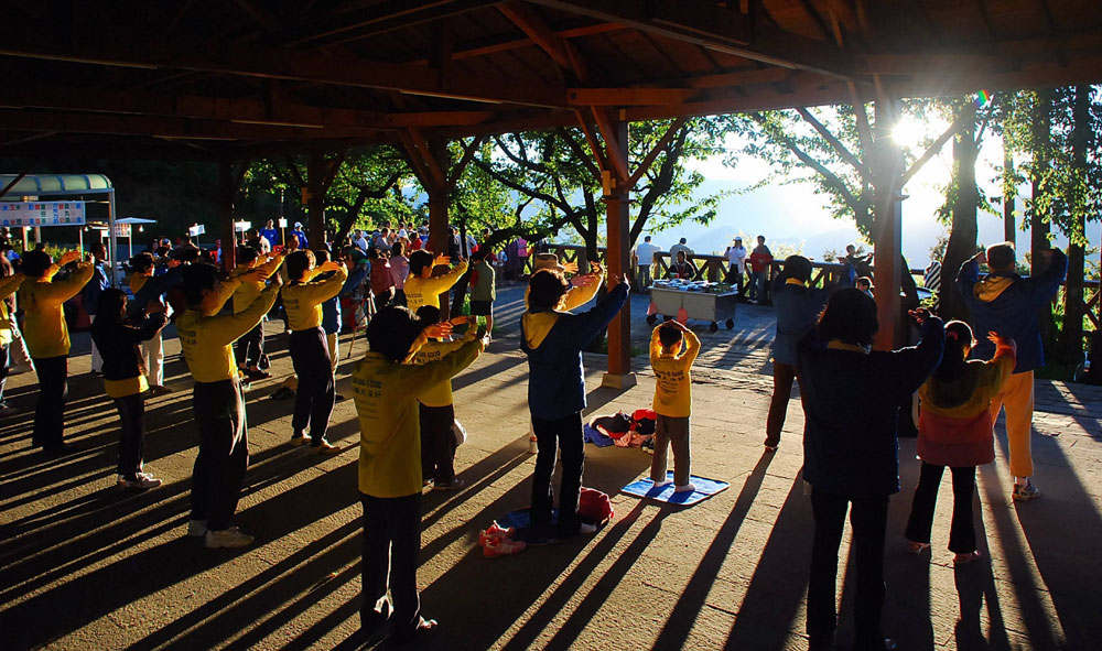 ![]() 在阿里山祝山学员迎着第一道晨曦演炼功法 |