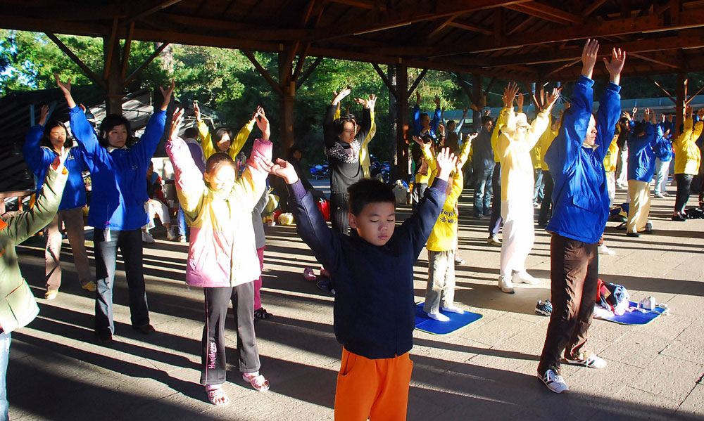 跟着父母修炼法轮功多年,开学将升国小五年级的凯裕,从通往姐妹潭的步道跑下来,手上还拿着法轮功的简介,他说:“我小时候身体很虚弱,后来学了法轮功身体变好了,我到阿里山来就是为了让大陆游客知道法轮功是好的,不是象中共讲的那样。”