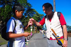 八月十九日一早,这群大法小弟子在阿里山车站学法后,就跟着法轮功学员到木兰园学习如何向大陆游客讲真相、如何劝人退出中共邪*党-。他们在木兰园一带向路过的大陆游客发送真相资料,也有的拿着纸莲花飞奔在森林步道里,穿梭游客间,传递大法的美好,同时也有学员带着小弟子排在路边打腰鼓,还以手语带动唱的轻松方式,吸引游客来了解法轮功真相。