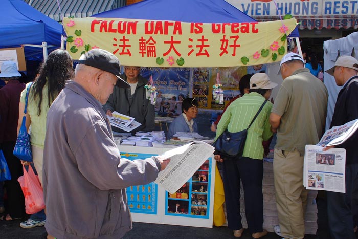 从中国大陆到美国旅游的刘女士星期天来到法轮功的展位。当她接过法轮功学员递过去的真相资料时,有人警告她不要拿,还威胁她说,拿法轮功的资料,回国后中共会抓她。刘女士气愤的表示,共产党太坏了,她家里被中共定为“黑五类”,她恨共产党。她当场退出了以前加入的中共组织少先队。