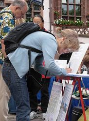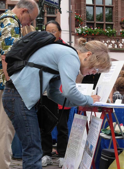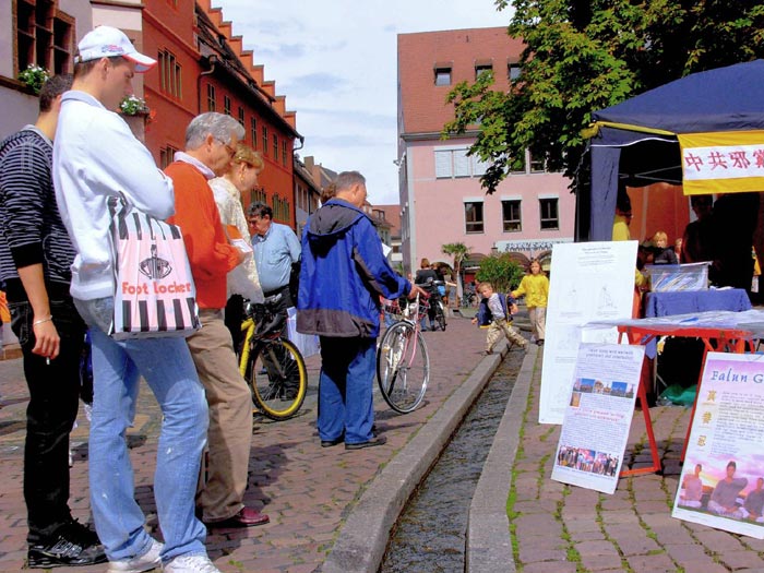 二零零八年八月二十三日,德国南部的弗莱堡(Freiburg)市政厅广场上展出了法轮功学员受中共迫害的照片。法轮功学员在此发揭露中共活摘法轮功学员器官暴行的传单,并征集签名。