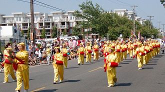 在法轮功的游行队伍里,经常能看到他的身影,指挥着一帮以老年学员为主的腰鼓队,精神抖擞,动作整齐,每次游行都获得观众的阵阵掌声。