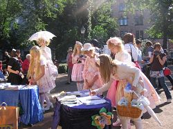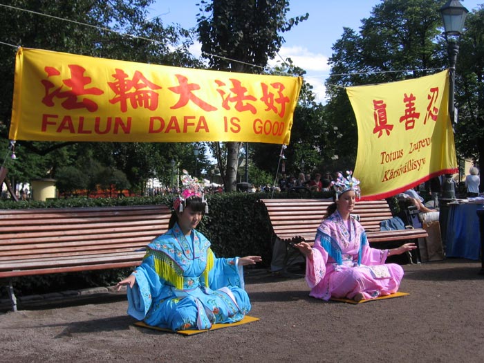 当天四位年轻法轮功女学员身着中国古装仕女服,无论是演示功法,还是散发资料,都引人关注,还不断被要求合影留念。