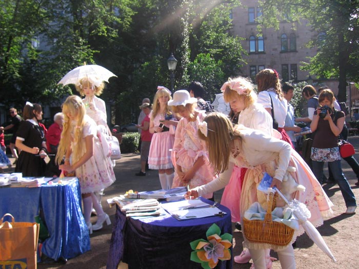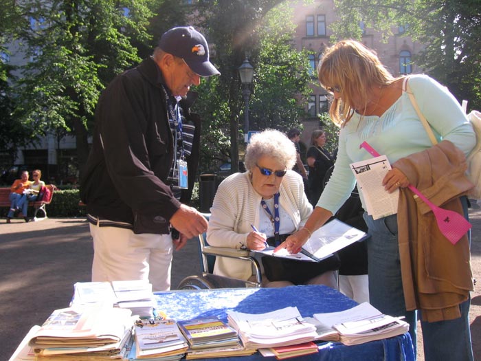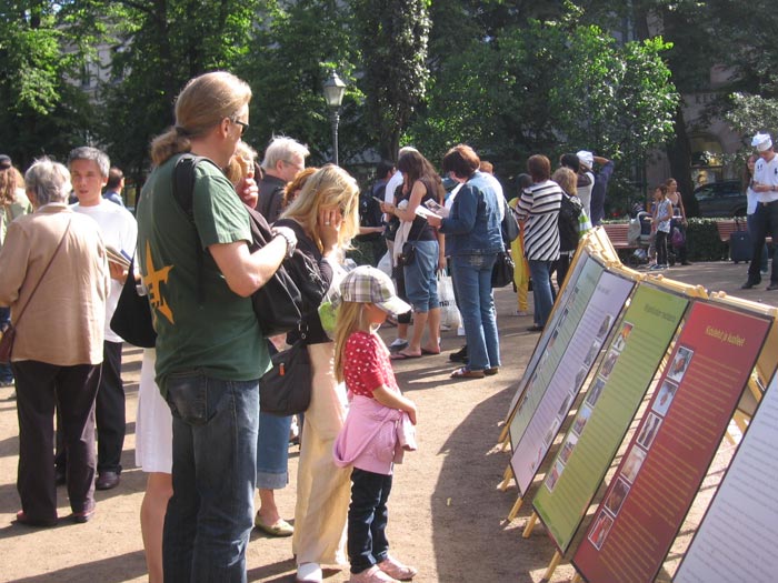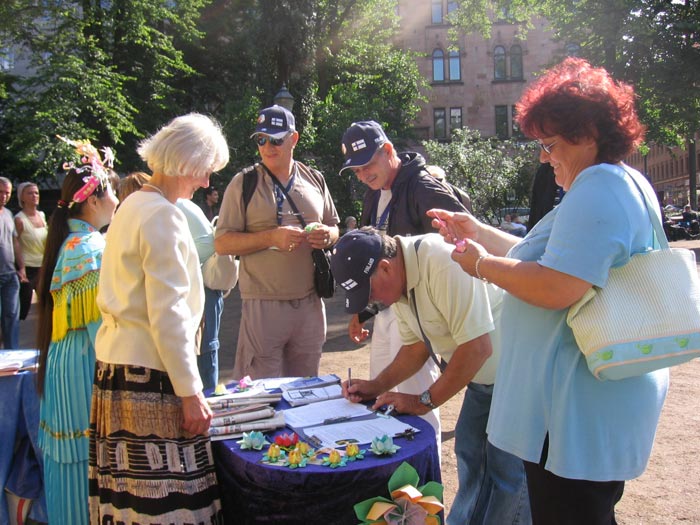 途经展位的芬兰、美国、德国、瑞典、土耳其、俄罗斯、拉脱维亚、阿尔巴尼亚、亚美尼亚、甚至还有特立尼达和多巴哥等国的游客,都对法轮功很感兴趣,也常看到征签桌前多人排队等候签名。