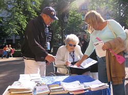 ![]() 一位坐轮椅的老人家在家人的帮助下也来声援法轮功 |