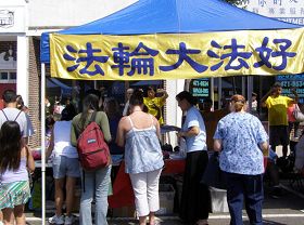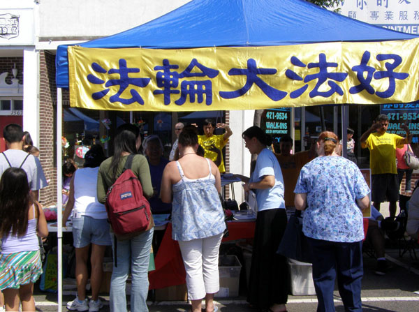 ![]() 赢得人们的欢迎和喜爱的法轮功摊位 |