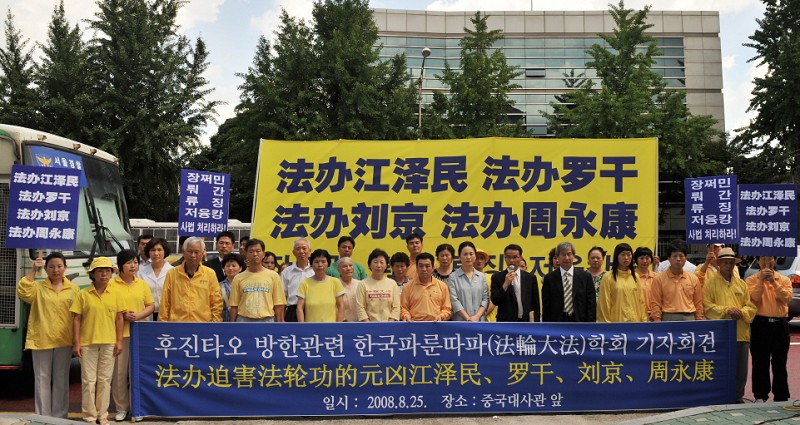 【明慧网二零零八年八月二十七日】胡锦涛访韩的当天(二零零八年八月二十五日),韩国法轮大法学会在驻韩中共使馆前举行新闻发布会,谴责中共对法轮功的
