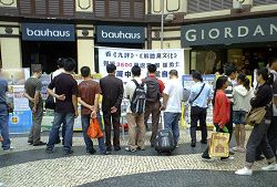 每星期天下午,学员们都到这里来讲法轮功真相,还告诉人们退!党!大潮的消息,并劝世人退出邪恶的共产党及其组织。有些游客看到《·九·评*共产党》一书如获至宝,迅速拿取,小心的收好。年轻人大多喜欢真相DVD、破网工具,还有的拿真相报纸或读展板,也有人把图片、横幅拍摄下来,一张不漏。