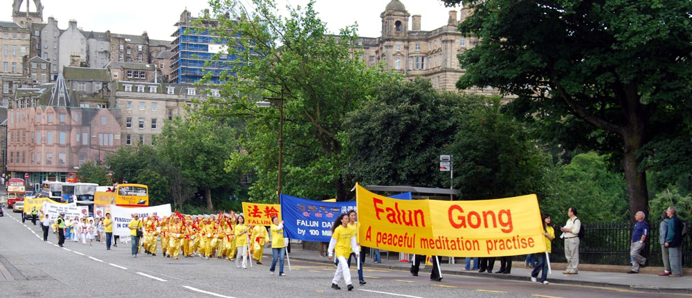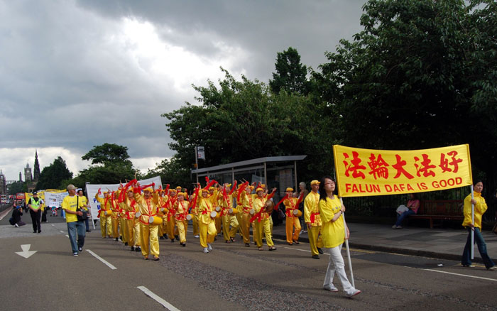 游行队伍由爱丁堡的警察开道,最前面是英文的法轮功大横幅,紧接着是写有“法轮大法洪传世界八十多个国家”和“法轮大法好”中英文的横幅。随后是身着亮黄色服装的腰鼓队。