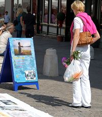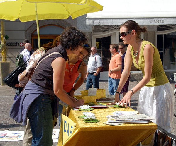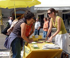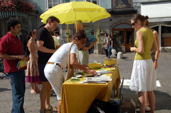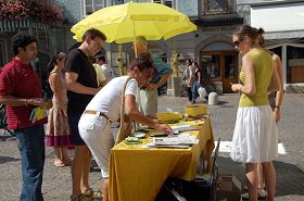 一位来自美国华盛顿的中年男士,对法轮功学员说,他是在华盛顿知道了法轮功学员被中共迫害的情况,并且在华盛顿看到过法轮功学员的游行活动。他表示,他很高兴在奥地利也看到了法轮功。并且对学员的活动表示支持。