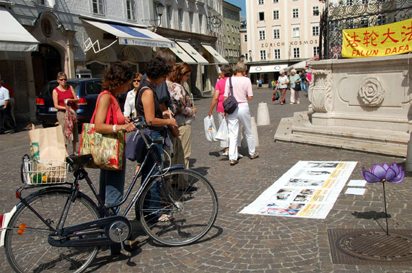 二零零八年八月三十日,部份萨尔斯堡大法弟子在萨尔斯堡市中心举行信息日活动,向全世界和本国民众揭露中共残酷迫害法轮功学员的暴行。很多游客排着队等着在征签表上签名,表示对法轮功学员的支持。