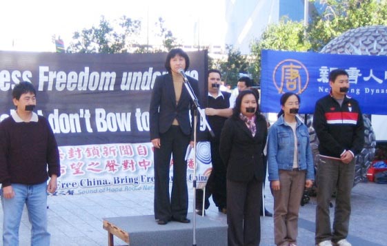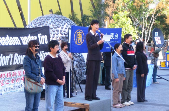 位于市中心的布里斯本广场(Brisbane Square)上,一群口贴黑色胶布的工作人员吸引了行人的目光。配合电视萤幕和卫星接收器等道具,他们无声的向民众传达了在中国新闻自由被扼杀的情况。