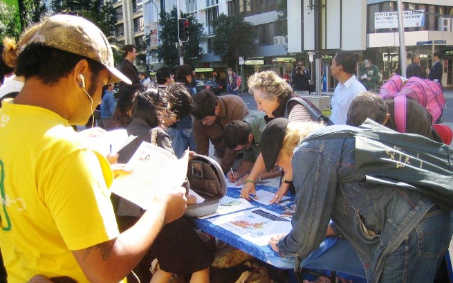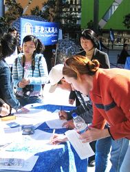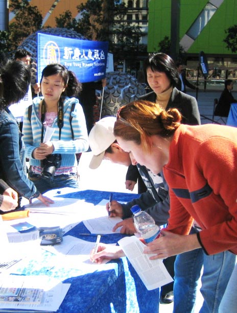 现场许多围观的民众前来写下他们支持的话语传真给欧卫公司。澳洲居民库曼斯(Greg Kooymans)表示:“我希望帮助中国人民重获言论自由,让那些受到人权迫害的人们能够得到帮助,使中国人也能重获人权。”维玛(Wilma)老太太则说:“在中国或任何一个地方的所有人都应该享有新闻自由。”