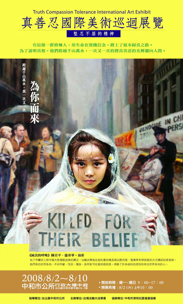 ![]() 真善忍国际美展在中和市公所展出的宣传海报 |