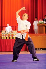 ![]() 永春拳台湾传人杨文旗(手握拳者)带领选手向大会致意 |