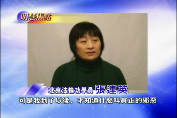 【主持人(岳峰)】观众朋友大家好,欢迎收看明慧焦点。在上一次节目中,原北京光大集团处级干部,注册会计师张连英,向我们讲述了她因为坚持修炼法轮功,2005年6月,被当局非法从家中抓走后,在北京劳教人员调遣处关押10个月所遭受迫害的经历,在接下来的节目中,她将继续讲述她在北京女子劳教所的经历,以及在这个过程中她的心灵感受。