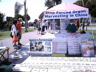 圣塔莫尼卡法轮功学员在这里的海滩公园摆设摊位,揭露中共迫害法轮功的真相,已经快三年了。每个星期天的下午,学员都准时到来,摆开展板、横幅、不同语种的传单、资料、征签表,并以模拟演示揭露中共活摘法轮功学员器官的罪恶。很多人受到震撼,强烈谴责中共的暴行,对法轮功学员无辜被迫害表示极大同情。