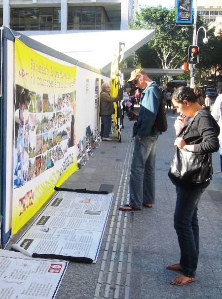 许多过路的民众都很关注法轮功问题。一位来自伊朗的妇女吉拉(Jila)被法轮功学员无辜遭受中共酷刑折磨的图片所震惊,她表示她的家人也曾因为不愿放弃信仰而遭受政府的迫害,她非常能理解法轮功学员的处境与心情。她认为没有任何人有权力迫害他人,“中共没有任何理由可以这样折磨百姓,无论是因为信仰、健身运动、政治因素,谁都没有权力迫害任何人。”