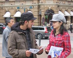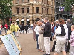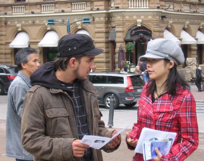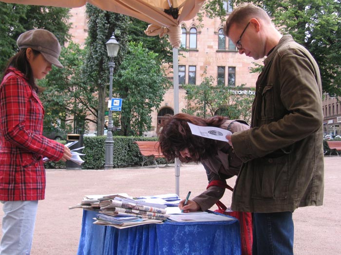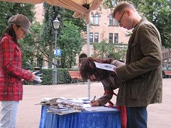 来自瑞典小城Väljö的白尔洁(Birjilh)女士主动的找到学员索要资料,并签名声援停止迫害。她说:“我是从我们那的广播里听到法轮功的”,并希望能够多了解一些。又有一位男士,询问学员有没有更多的瑞典语资料。在拿到了瑞典语版的大.纪.元;报纸和《·九·评*共产党》后很高兴的离开了。