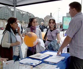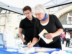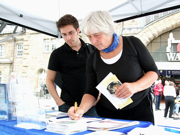 信息台前,一个德国中年男子停下了脚步。当学员跟他谈到法轮功学员被中共活体摘取器官时,他大声的说:“真是太可怕了。”他立刻签名支持法轮功,呼吁制止这场迫害。