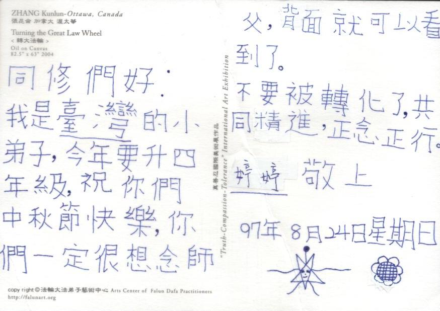 我家的小同修用纯净的心画了一幅营救同修的画。她还拿了她最喜欢的明信片,写了以下这封信,要我帮她寄给被非法关押的同修。上面写着:“我是台湾的小弟子,今年要升四年级。祝你们中秋节快乐。不要被转化了,共同精進,正念正行。”