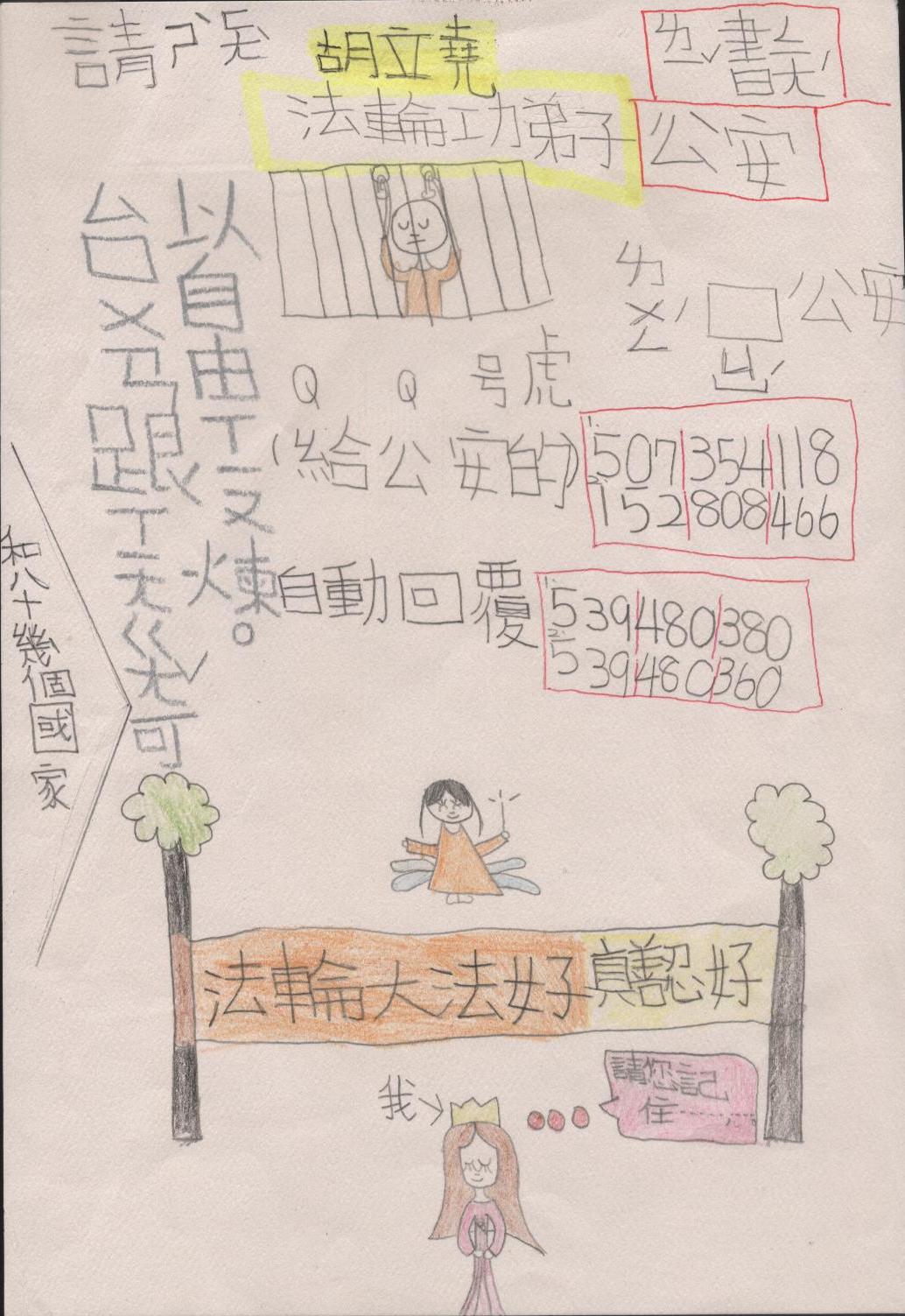 台湾小弟子写信大陆公安,要求立即释放被非法关押的法轮功学员胡立尧