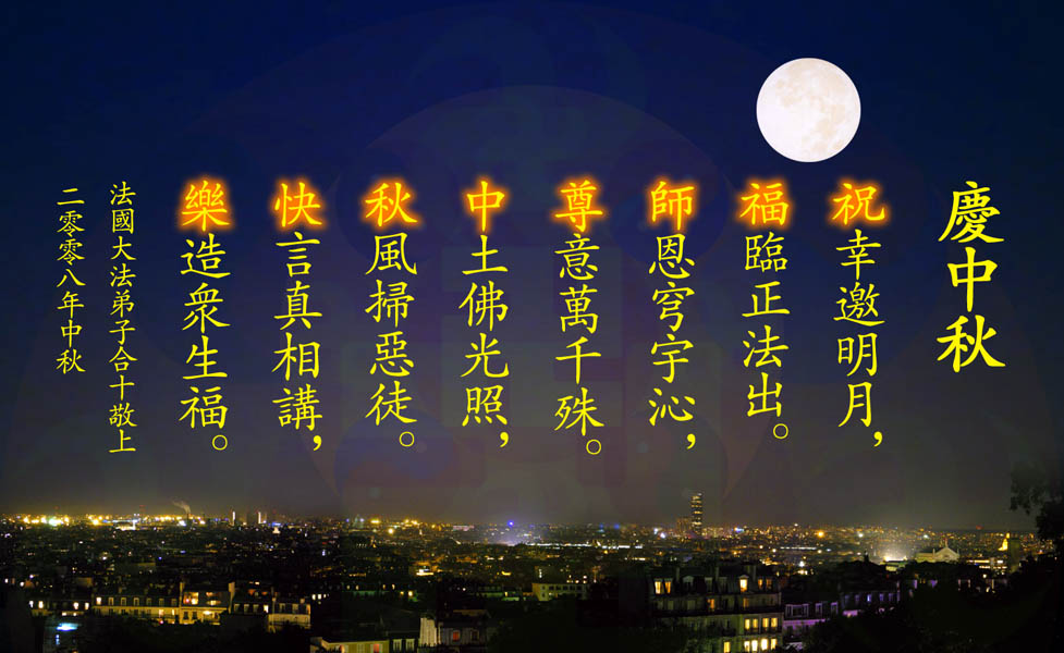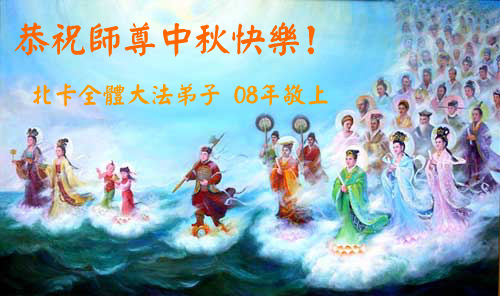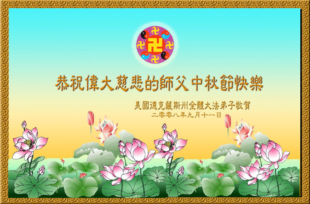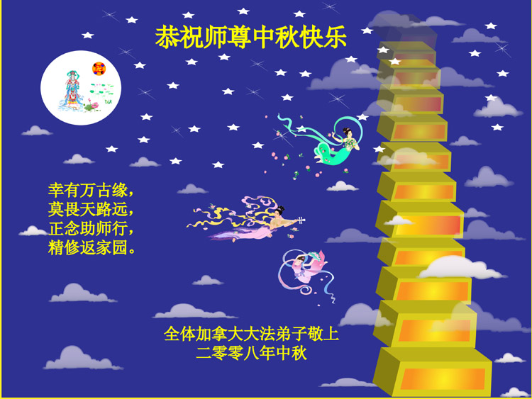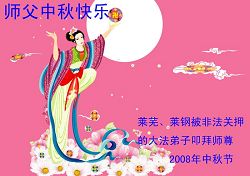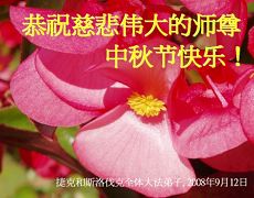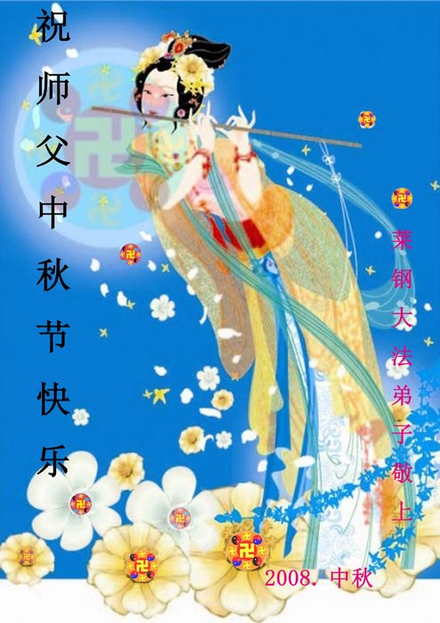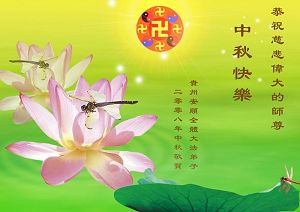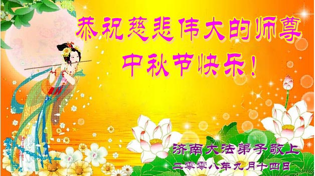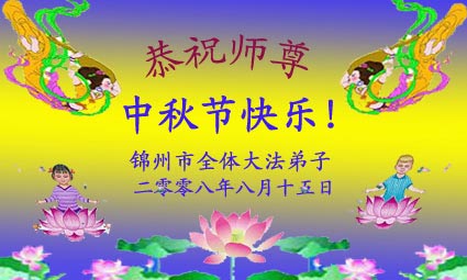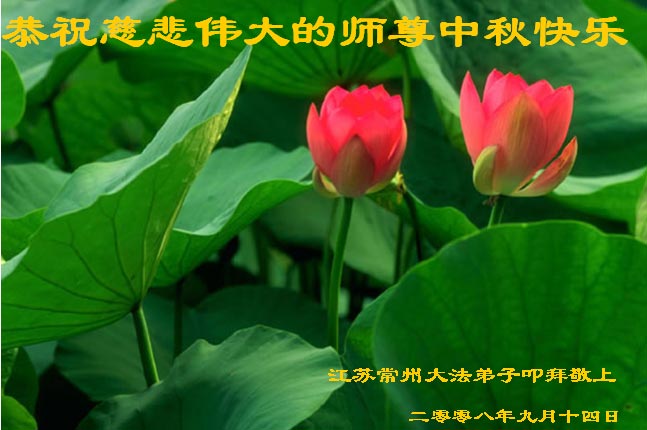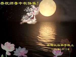 在二零零八年中秋佳节到来之际,我们中国大陆江苏常州大法弟子向您表示最真诚的祝愿!祝师尊中秋节快乐!我们一定做好三件事,走好正法修炼的最后这段路,救度更多的众生,完成助师正法的史前大愿,完成正法时期大法弟子的神圣使命!