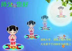 尊敬的师尊:您好!在二零零八年中秋佳节到来之际,我们重庆市沙坪坝区全体大法弟子向您表示最真诚的祝愿!祝师尊中秋节快乐!我们一定按照师尊的要求,做好三件事,走好正法修炼的最后这段路,发挥最大的能力,救度更多的众生,完成助师正法的史前大愿,不负正法时期大法弟子的神圣使命。