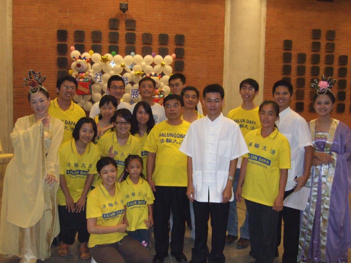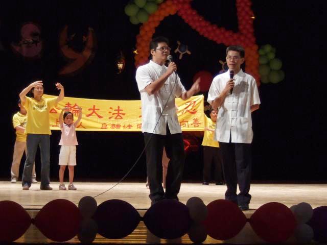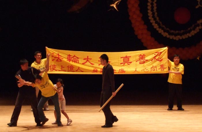 这是二零零八年九月十八日台湾中山大学新一届学生入学活动----社团联展晚会,在“法轮大法社”演出结束时的一幕。