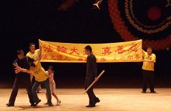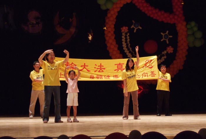 晚上九点半,轮到社团“法轮大法社”的表演。“飞旋的法轮”歌曲一响,大幕拉开,一片金黄,台下一阵热烈鼓掌,穿着印有“FALUN DAFA”、“法轮大法”字样鲜黄色衣衫的五位法轮功学员演示着法轮功五套功法,与后面拉出的“法轮大法”字样的三米金黄横幅,在舞台灯光下形成一条宽大金光带,向台下放射着光芒。