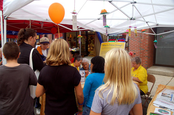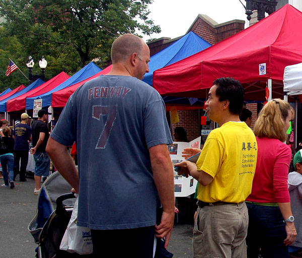 一位母亲带着自己的小孩来法轮功的展位,听到法轮功学员在中共的迫害之下,依然坚韧不屈、出污泥而不染后,又转身再带来另外三个小朋友,大伙儿一起学摺叠纸莲花、听法轮功真相。当她得知法轮功学员为弘扬正统神传中国文化的努力时,立即表示将会到波士顿看神韵艺术团的演出。