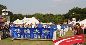![]() 法轮功天国乐团在热气球发射场地前表演 |