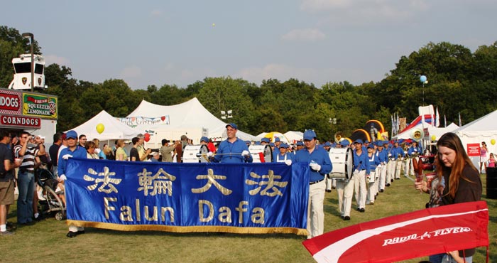 傍晚六点是热气球发射的时间。五点以后,Oak Point 公园内连远处的山丘都坐满了来看气球升空的人们,在公园内各处游玩的人们也都聚集到气球发射场地附近。这时候,天国乐团在人群中为人们演奏了“法轮大法好”、“美丽的美利坚”、“法鼓法号震十方”、“法正乾坤”等乐曲,在这个整个过程中,指挥的学员还向观众介绍了天国乐团成立的背景,什么是法轮功,告诉人们信仰“真、善、忍”的法轮功学员在中国大陆遭到中共的迫害。许多人都接过学员送过来的传单认真的阅读、了解。