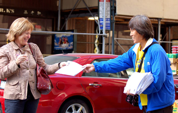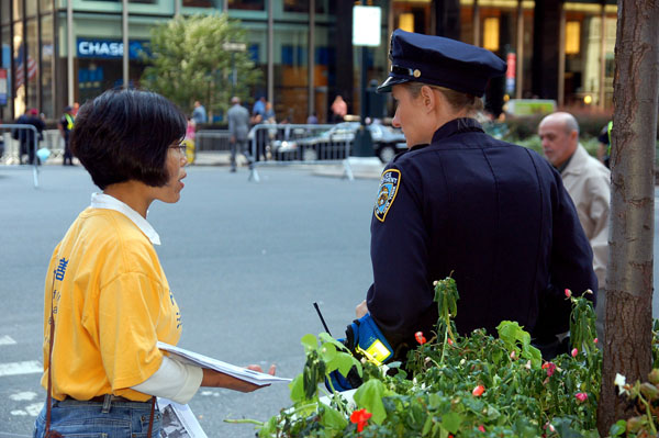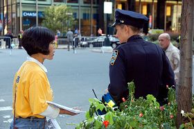 ![]() 法轮功学员向纽约警员讲真相。 |