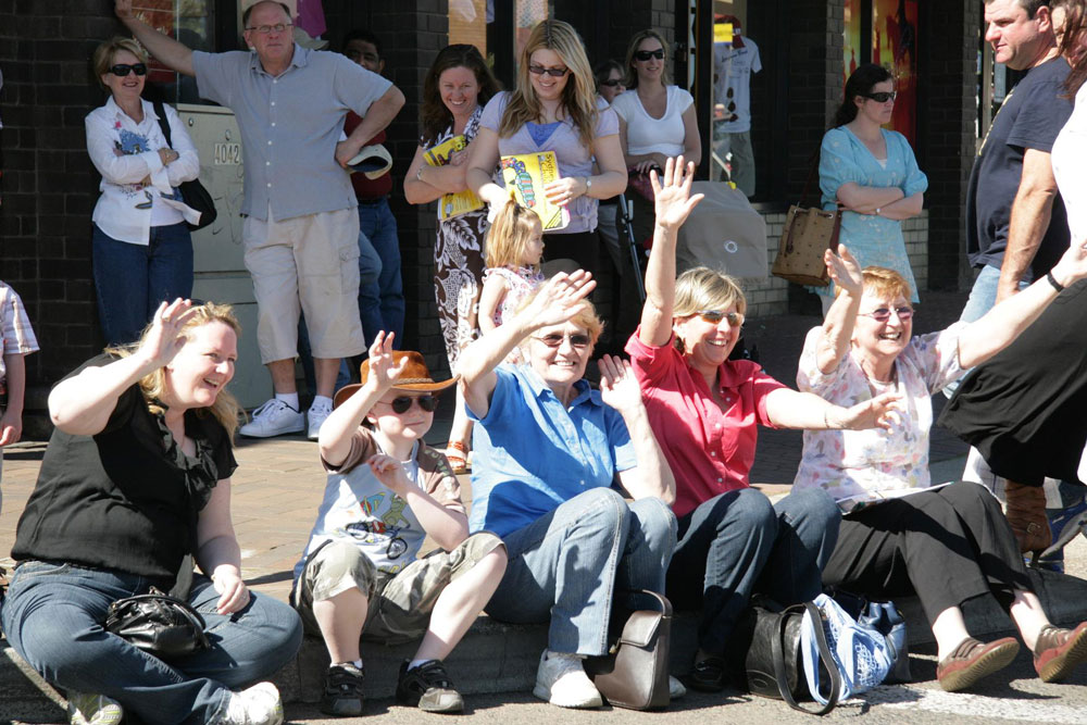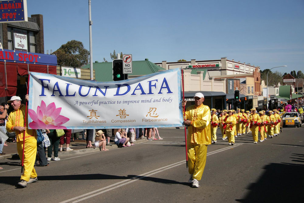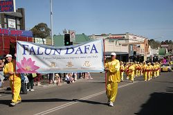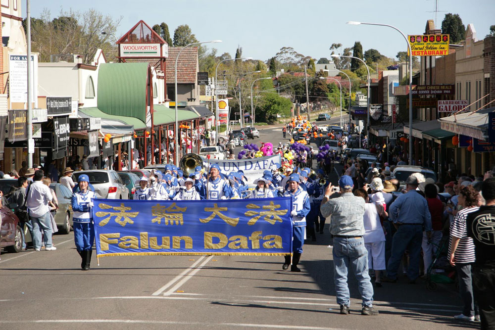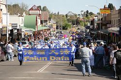 下午二点钟,小镇市中心的主街 Bong Bong街上人声鼎沸,五彩缤纷的游行队伍,吸引了无数路人驻足观看。各式各样的汽车造型车队、自行车队和古老的马车车队、学校的军乐团和社区组织的舞蹈队等代表着各民族团体的文化。法轮功学员作为唯一的华人团体参加了这次游行。