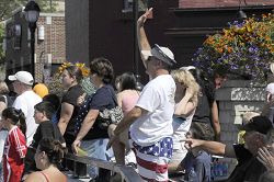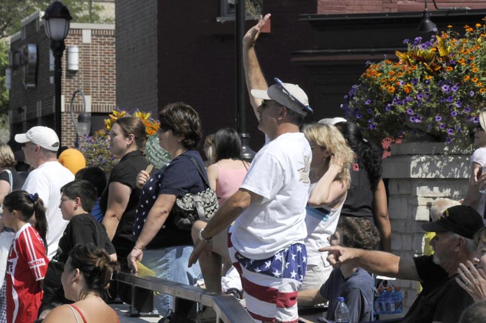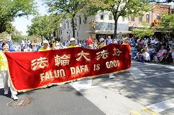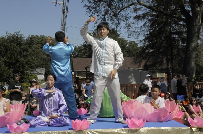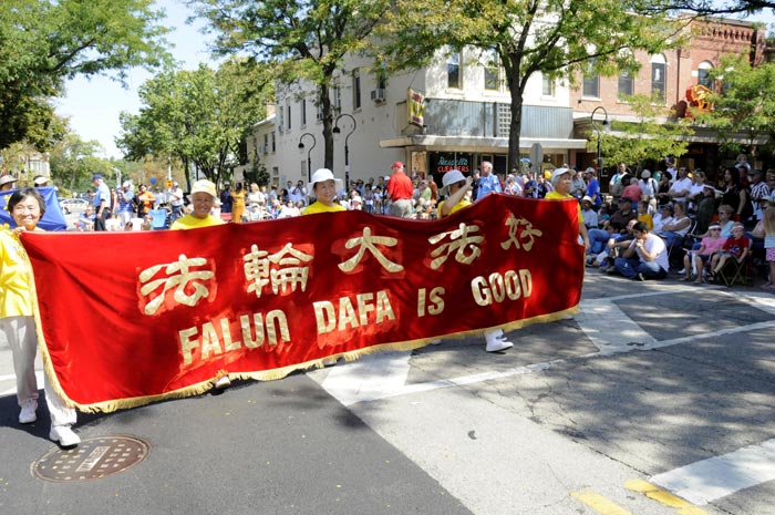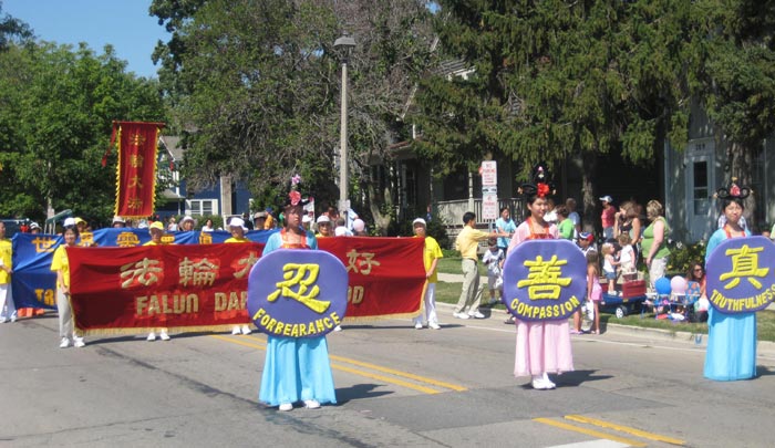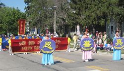 美中法轮大法佛学会已经第五年被邀请参加当地劳动节的游行活动。在一个半英里长的游行中,三名法轮功学员打扮成仙女手捧“真、善、忍”走在方阵的最前面,其后是在花车上学员为现场的观众展示了法轮大法的五套功法;走在队伍的后面的是中国传统的威风唐鼓阵。