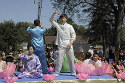 当游行队伍经过主席台的时候,主持人通过高音喇叭为在场的观众介绍了法轮大法“真善忍”的理念,以及包括中国大陆在内世界上八十多个国家传播的盛况,还对中国古老修炼意义上的简单解释。最后还告诉观众如果对法轮功感兴趣的话可以跟当地学员联系并留下了联系方式。