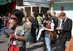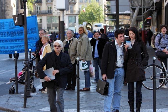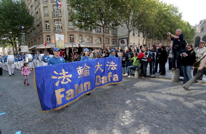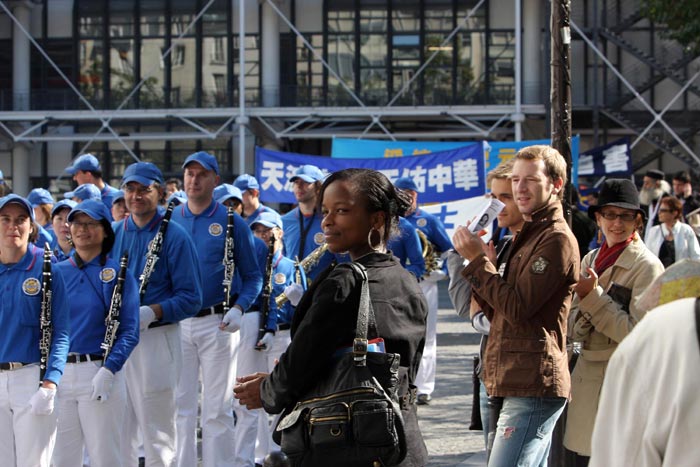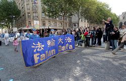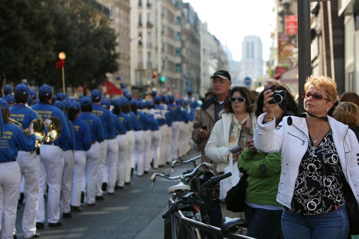这是二零零八年九月二十七日法国首都巴黎的一幕,来自欧洲许多国家的部份法轮功学员聚集在巴黎,举办了“法轮大法好、制止中共迫害法轮功、呼吁全社会关注欧卫向大陆停播新!唐!人:事件”等为主题的游行集会,有部份法轮功学员沿途派发真相资料给路人;在沿途观看的民众中,有不少是从中国大陆来欧洲旅游的,其中有十四位中国人在听了真相后,退出了中共邪*党-及相关组织。