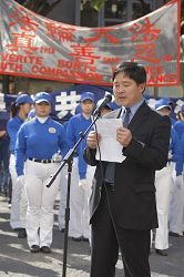 德国国际人权组织代表吴曼扬在发言中说:“国际人权组织是德国最大的人权组织,几十年来一直在跟踪中国的人权状况,我们有无数的证据证明中国的人权纪录非常糟糕,中国在由共产党统治之后,就成为全世界最大的人权破坏者,为了他们的政权需要,就迫害各种各样的团体,只要他们认为哪一个团体不为它服务、不听它的话,他们就要对这个团体进行迫害,为了实行这些迫害,它也不希望老百姓知道这些真相,所以就用尽一切办法来封锁真相消息。中国的老百姓在中共的单方面信息灌输下,他们以为帮助中共去迫害法轮功学员、去镇压民运人士和西藏的佛教徒是好事,可实际上他们无形中做了中共杀人的帮凶。”