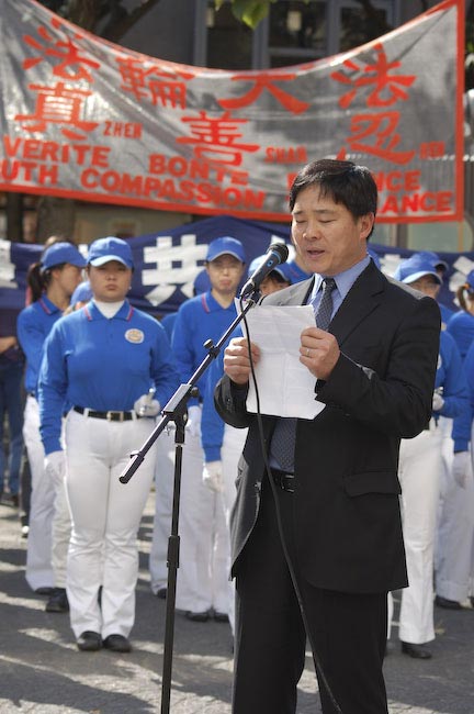 法轮大法学会会长唐汉龙接受采访时说:“我们这次活动的首要目地是向全社会讲清法轮功的真相,传播真、善、忍好、法轮大法好的信息,同时也涉及到有关法轮功的人权被迫害的问题,比如‘欧卫’屈服中共停止了新!唐!人:向大陆的播出等,我们也要将四千三百万中国人退出中共各种组织的消息传播到全社会。我们希望通过这次活动,将这些信息告诉法国人民和媒体。”