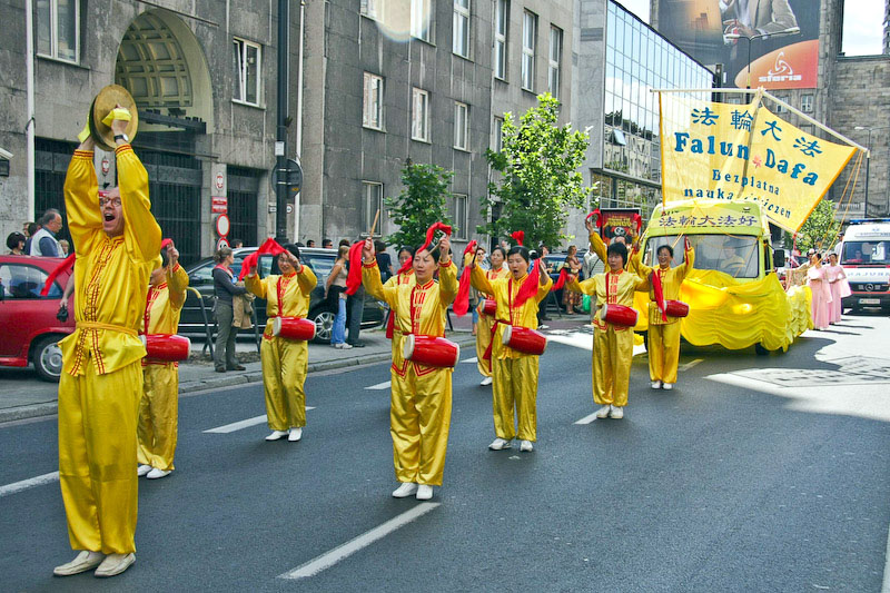 在游行队伍中,一辆挂有“法轮大法好”的船型车格外引人注目。车上,身着黄色炼功服的法轮功学员向两旁观众展示优美祥和的五套功法,车前车后,是由法轮功学员组成的舞蹈队和腰鼓队,车旁,学员身着唐装向观众发放法轮功真相传单。一摞又一摞的传单几乎都被“一抢而光”,阵阵鼓声伴着“法轮大法好”歌声在空中回荡着,精彩表演,赢得观众的热烈掌声,古老中华文化,深深打动波兰人的心。