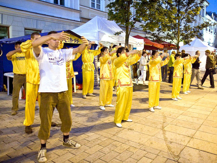 舞蹈队、腰鼓队开始了巡回表演,所到之处,受到波兰人的热烈欢迎,五套功法让人感觉耳目一新,莲花舞、腰鼓舞尽展中华风采。波兰法轮大法学会会长TOMEKKOWALSKI向观众讲解法轮功的特点及发展历程,现场约有上万名波兰人观看了功法演示。从头到尾,不断有人要求合影,与“法船”合影,与舞蹈队员合影,与腰鼓队员合影,与身着炼功服和身着唐装的法轮功学员合影。华沙各地方媒体也不断采访法轮功学员。神奇的中国文化,深深吸引着波兰人。